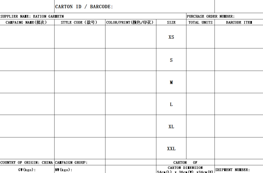 Detailed box marking information and product description, such as box number, weight, style number, etc.